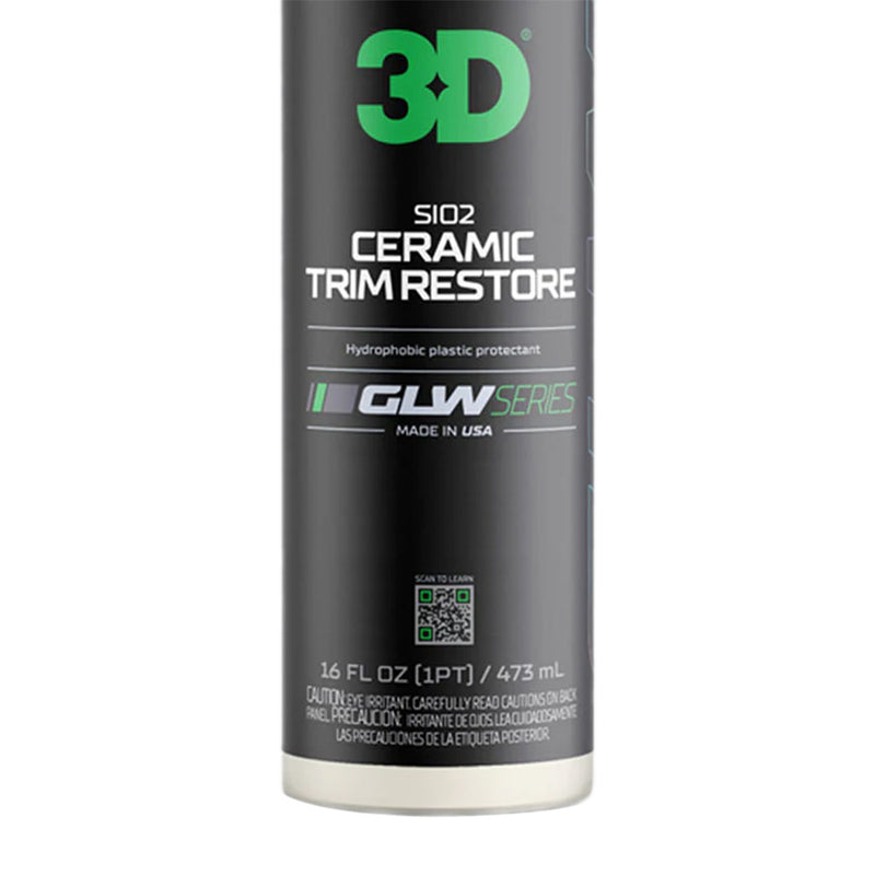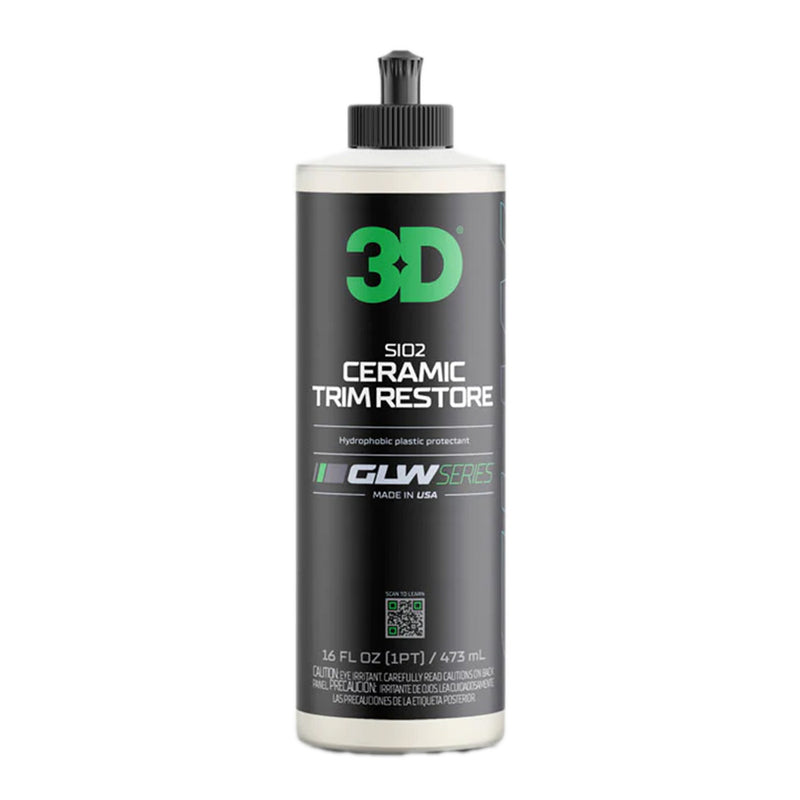 The 3D GLW Series SiO2 Ceramic Trim Restore is designed to rejuvenate and protect your vehicle's plastic trim. 3D's innovative formula is engineered to restore and repair the effects of UV and elemental oxidation. Revitalize plastic trim and add a layer of hydrophobic protection with Ceramic Trim Restore.