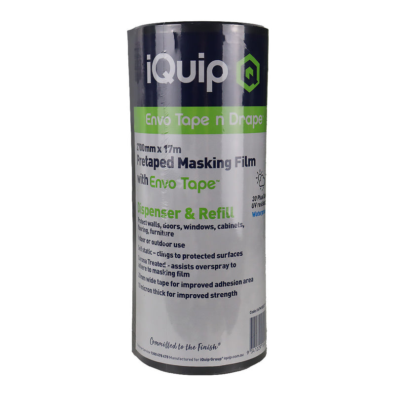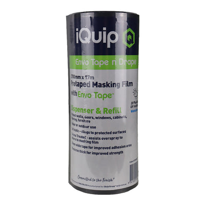 The iQuip Envo Pretaped Mask Film with Dispenser is a high-performance masking solution designed for fast, clean and efficient surface protection during painting, spraying and renovation work. The static-cling film unfolds easily and adheres securely to surfaces, while the premium tape edge ensures crisp, clean paint lines.