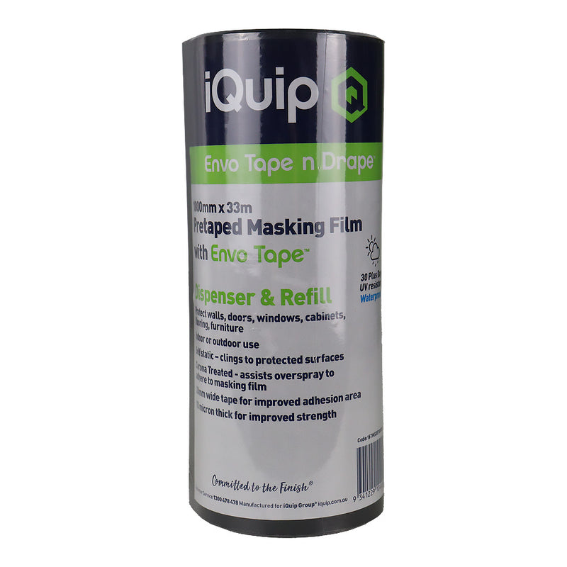 The iQuip Envo Pretaped Mask Film with Dispenser is a high-performance masking solution designed for fast, clean and efficient surface protection during painting, spraying and renovation work. The static-cling film unfolds easily and adheres securely to surfaces, while the premium tape edge ensures crisp, clean paint lines.
