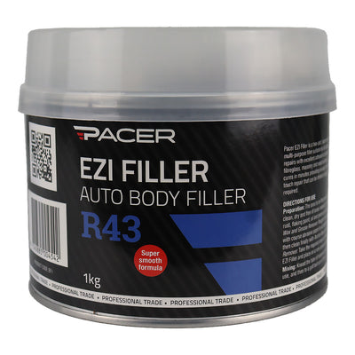 PACER R43 Ezi Filler 1kg is a two-component, ultra-smooth body filler ideal for automotive, fibreglass, aluminium, wood and masonry repairs. Designed for fast curing and easy sanding, it provides excellent adhesion and a durable base for primers and topcoats