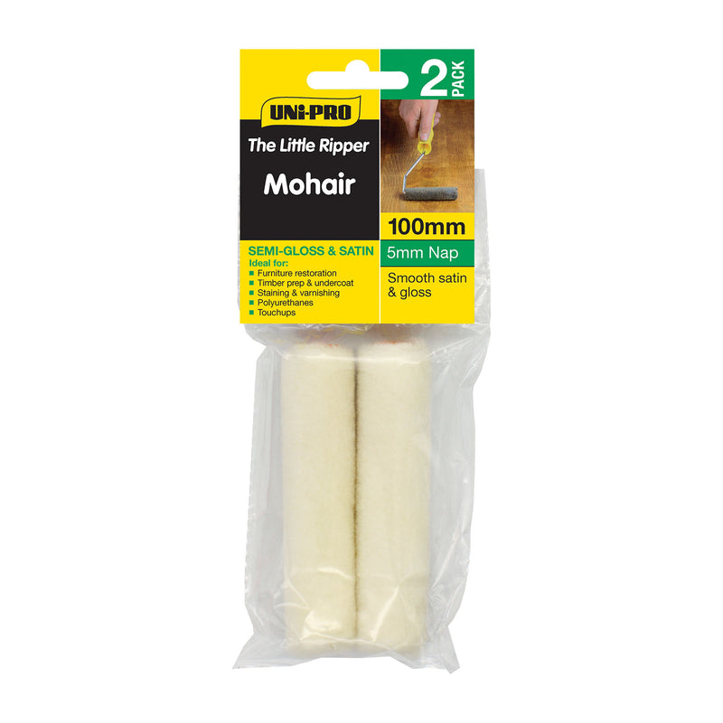 UNi-PRO Little Ripper Mohair Roller Covers deliver a professional, ultra-smooth finish for gloss, enamel and polyurethane paints. Designed for small surface areas and detailed applications, these 100 mm mini rollers use high-quality woven mohair for a consistent, lint-free result on doors, cupboards, trims and furniture.