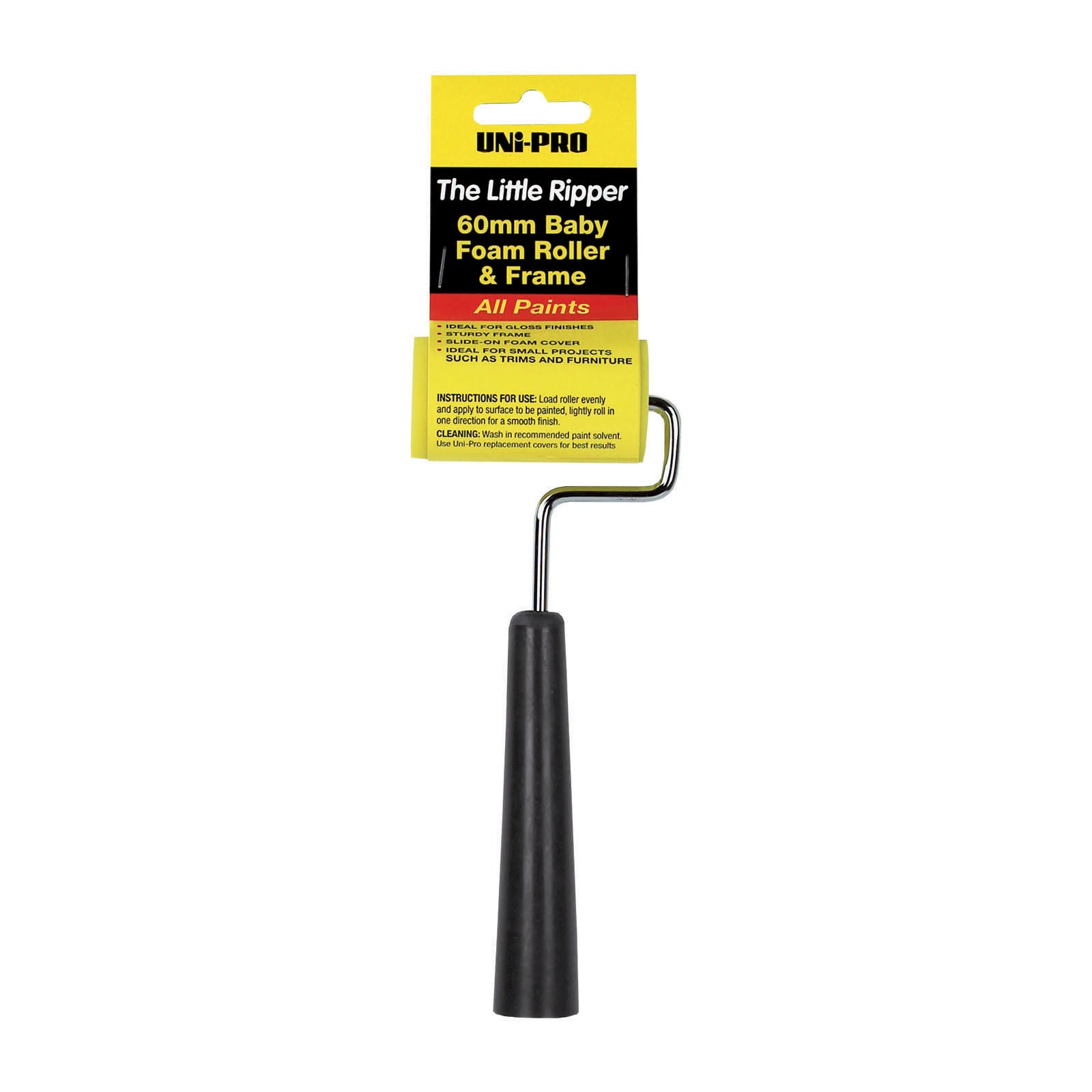 The UNi-PRO Little Ripper Baby Foam Roller & Frame 60mm is a compact tool designed for precise painting in small areas. It includes both the foam roller and frame, ready to use for trims, furniture edges, and detailed projects.